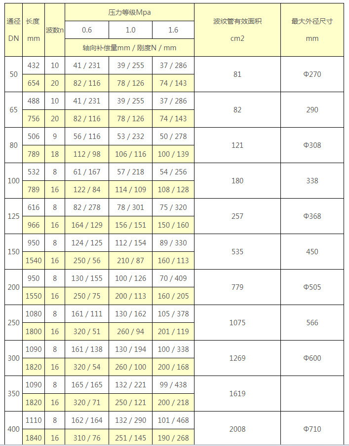 舉例:0.6TWY500×8JB表示:公稱通徑為500mm,工作壓力為0.6MPa(6kg/cm2)波數(shù)為8個,不銹鋼管連接的軸向型外壓式波紋補償器。