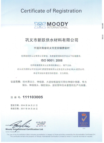 1. 歡迎來到鞏義市新躍供水材料有限公司官方網(wǎng)站!您現(xiàn)在訪問的是:《ISO9001中文認(rèn)證》頁面,如需幫助請(qǐng)致電:13140066578 或 0371-64100988